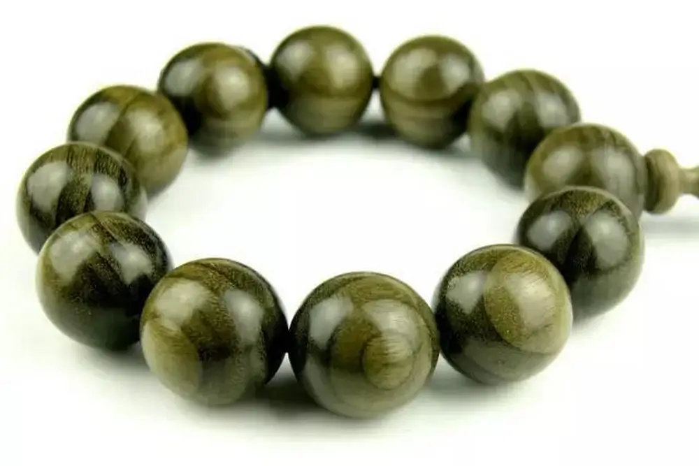在红木之外,则要数金丝楠手串的盘玩效果更好了,因为本身材质细腻,再加上木纤维中的金丝结晶,荧光效果非常棒。但金丝楠手串因为本身的油脂要弱于小叶紫檀手串,所以虽然也会形成自然包浆,但是效果却非常一般,尤其是在经常不接触皮肤的情况下。如果经常佩戴,哪怕不盘玩,也会因为皮肤上的油脂而形成包浆,只是速度较慢,而且效果较差。只有经常的盘玩才会有最漂亮的包浆出现。